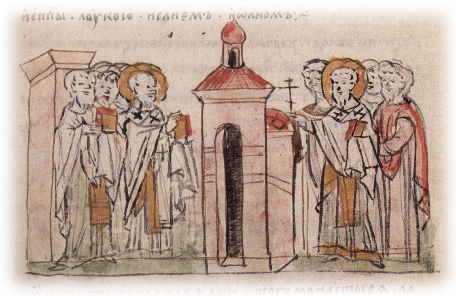 "В лето 6596. Священа бысть церкви святого Михаила монастыря Всеволожа митрополитом Иоаном и епископы Лукою, Исаием, Иоаном".