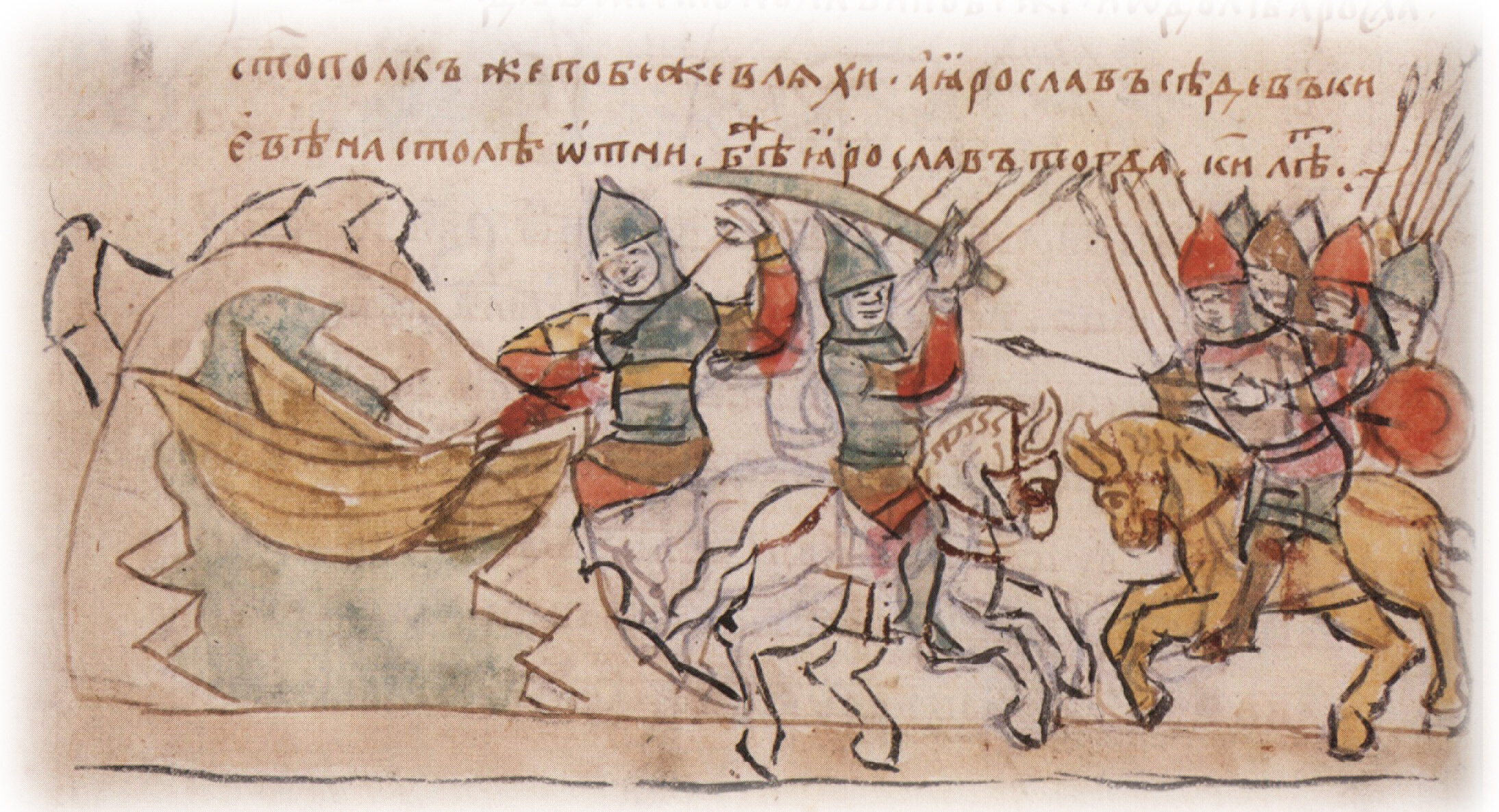 Высадка Ярослава Владимировича с воинами на берег и отталкивание ладей от берега; сражение войск Ярослава с войсками Святополка Владимировича.
