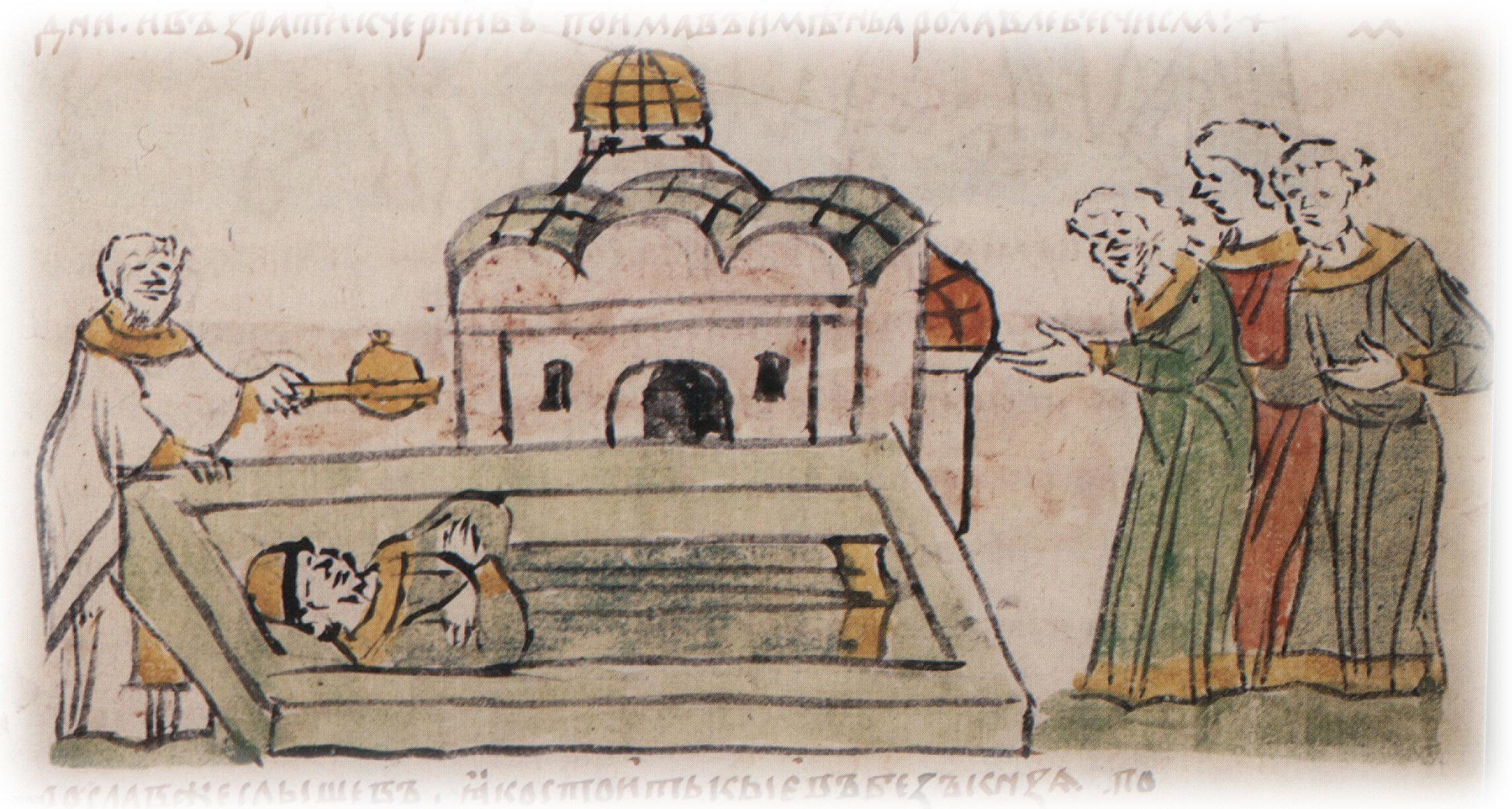 Тайное погребение Владимира Святославича, умершего в Берестове: спуск его тела на землю на ковре между разобранными клетьми здания; положение тела Владимира в мраморный гроб в церкви Святой Богородицы.