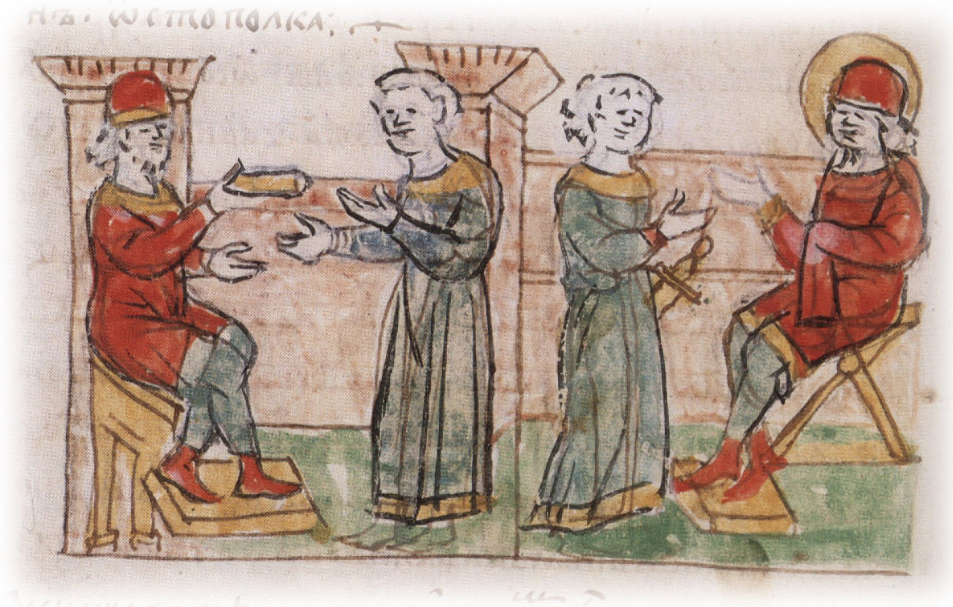 Посылка гонца Ярославом Владимировичем к брату Глебу с известием о смерти отца и об убийстве Святополком Владимировичем их брата Бориса; получение Глебом печального известия и оплакивание умерших.