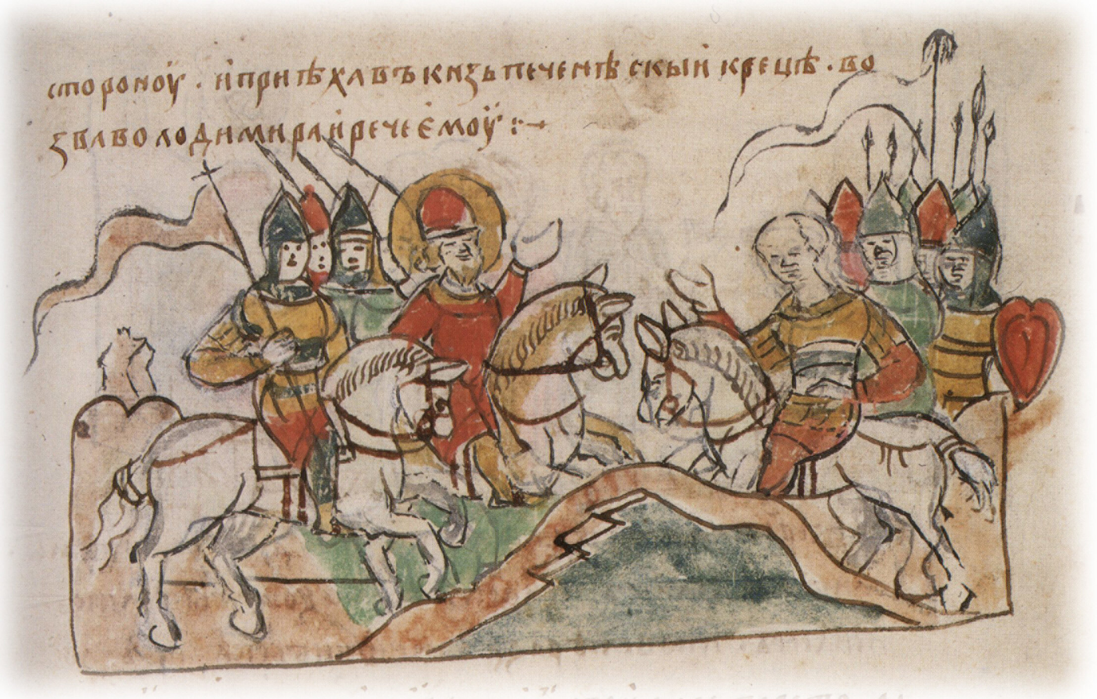 "В лето 6501. ...И ста Володимир на сей стороне, а печенези на оной, и не смеяху сии на ону сторону, ни они на сю сторону. И приехав князь печенескый к реце, возва Володимира и рече ему: «Выпусти ты свой мужь, а я свой...»".
