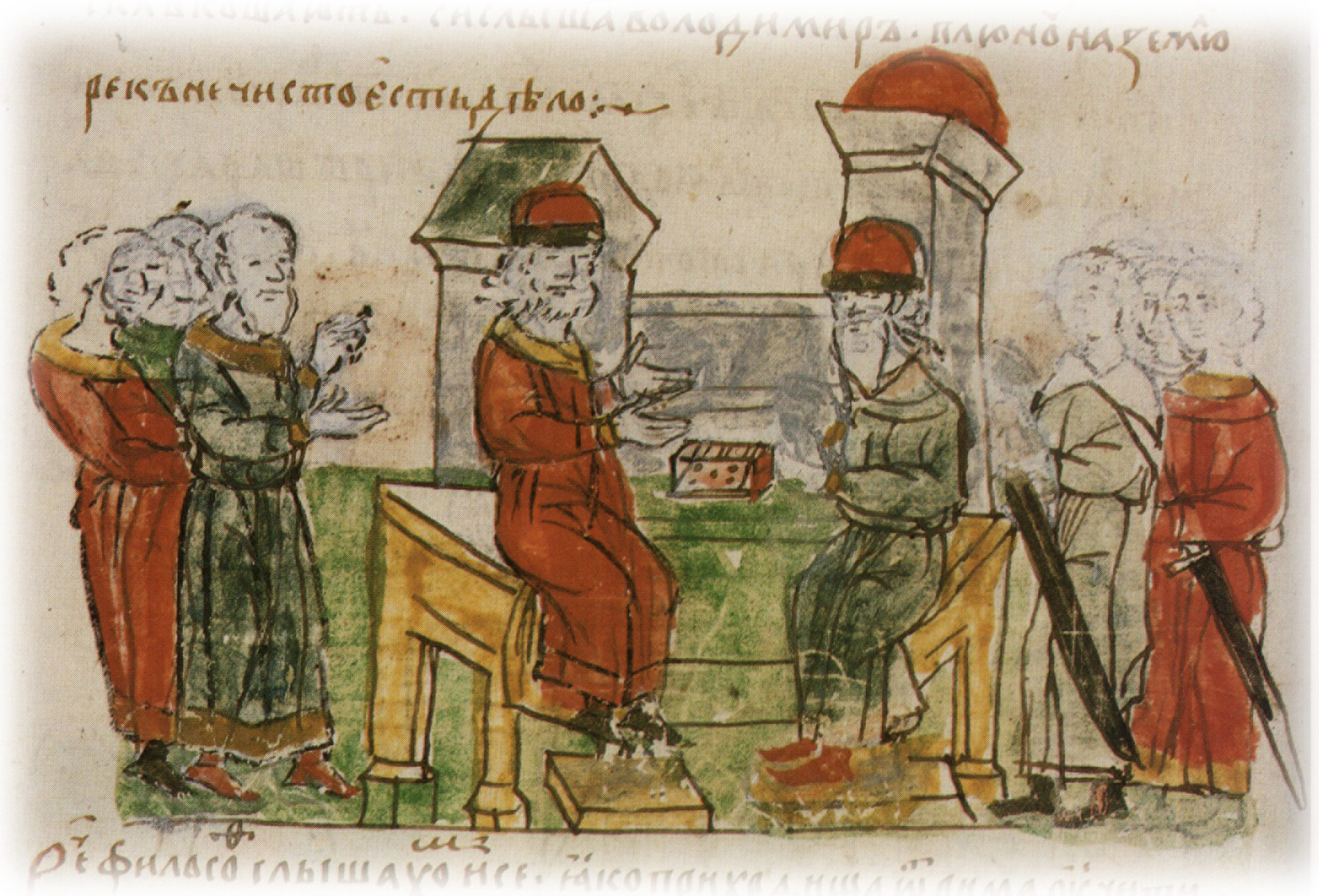"По сем же прислаша греци к Володимиру философа... Он же рече: «Послушаю рад». И нача философ глаголати..."