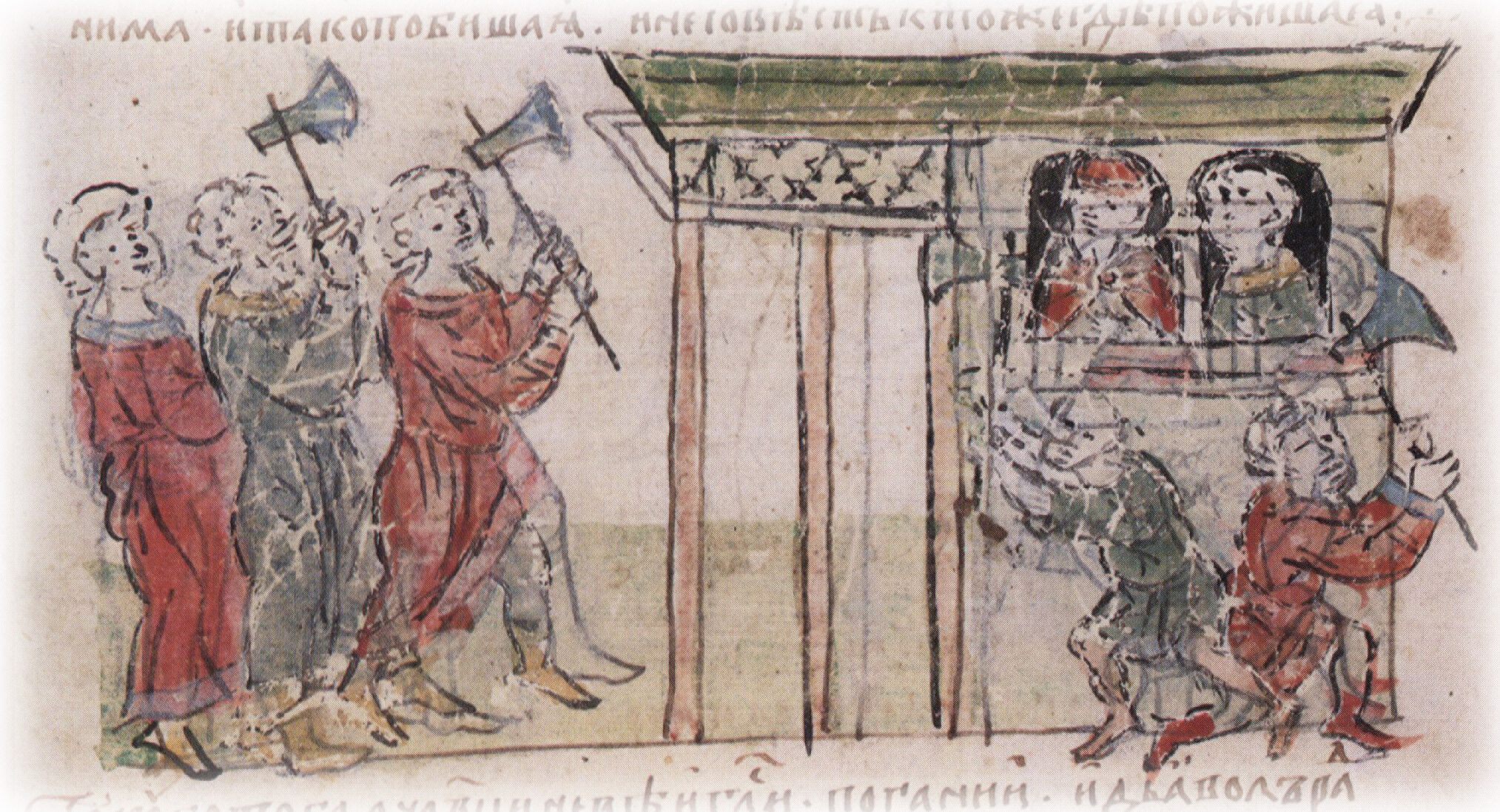 Разгром язычниками сеней в доме, где укрывался варяг-христианин с сыном, и убийство их.