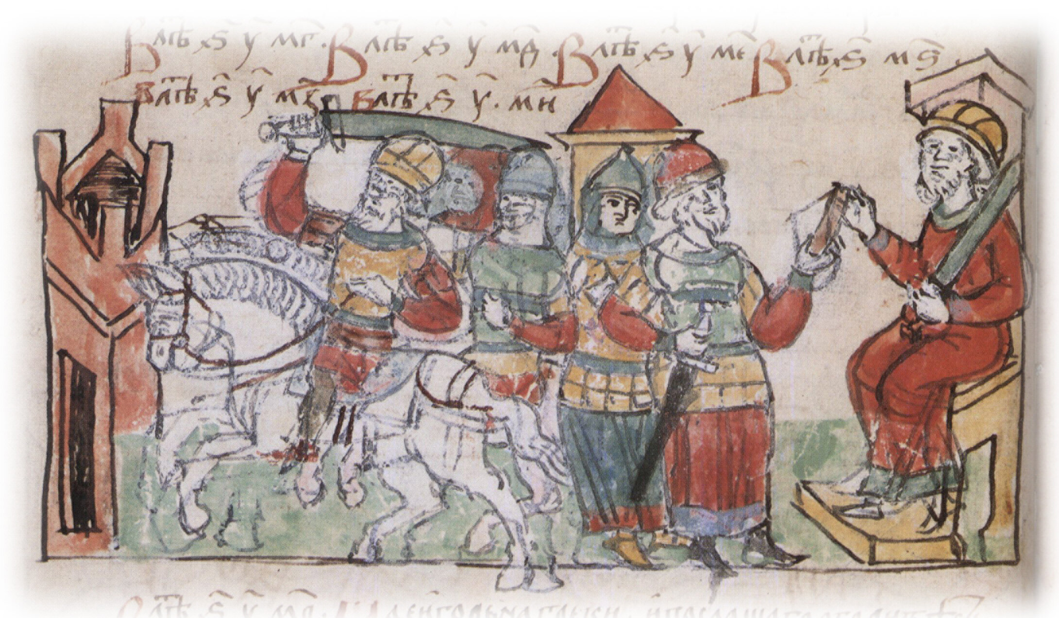 Тайное погребение Владимира Святославича, умершего в Берестове: спуск его тела на землю на ковре между разобранными клетьми здания; положение тела Владимира в мраморный гроб в церкви Святой Богородицы.