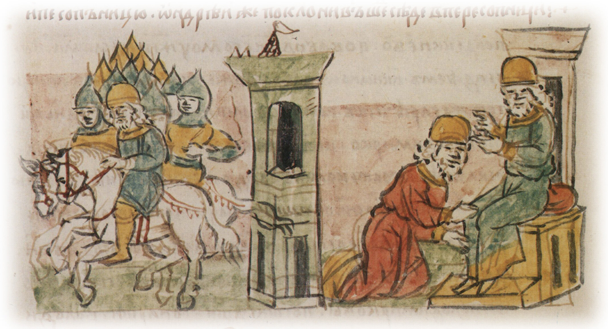 Рисунок "мастера Б" — перо. Правлен (фигуры, лица, шапки, шлемы, стол, архитектура, лошади) "мастера В" — кисть. Позднейшая пририсовка сбруи — перо. Еще более поздняя пририсовка шпиля и зубцов на архитектуре в центре и кнута (?) — перо.