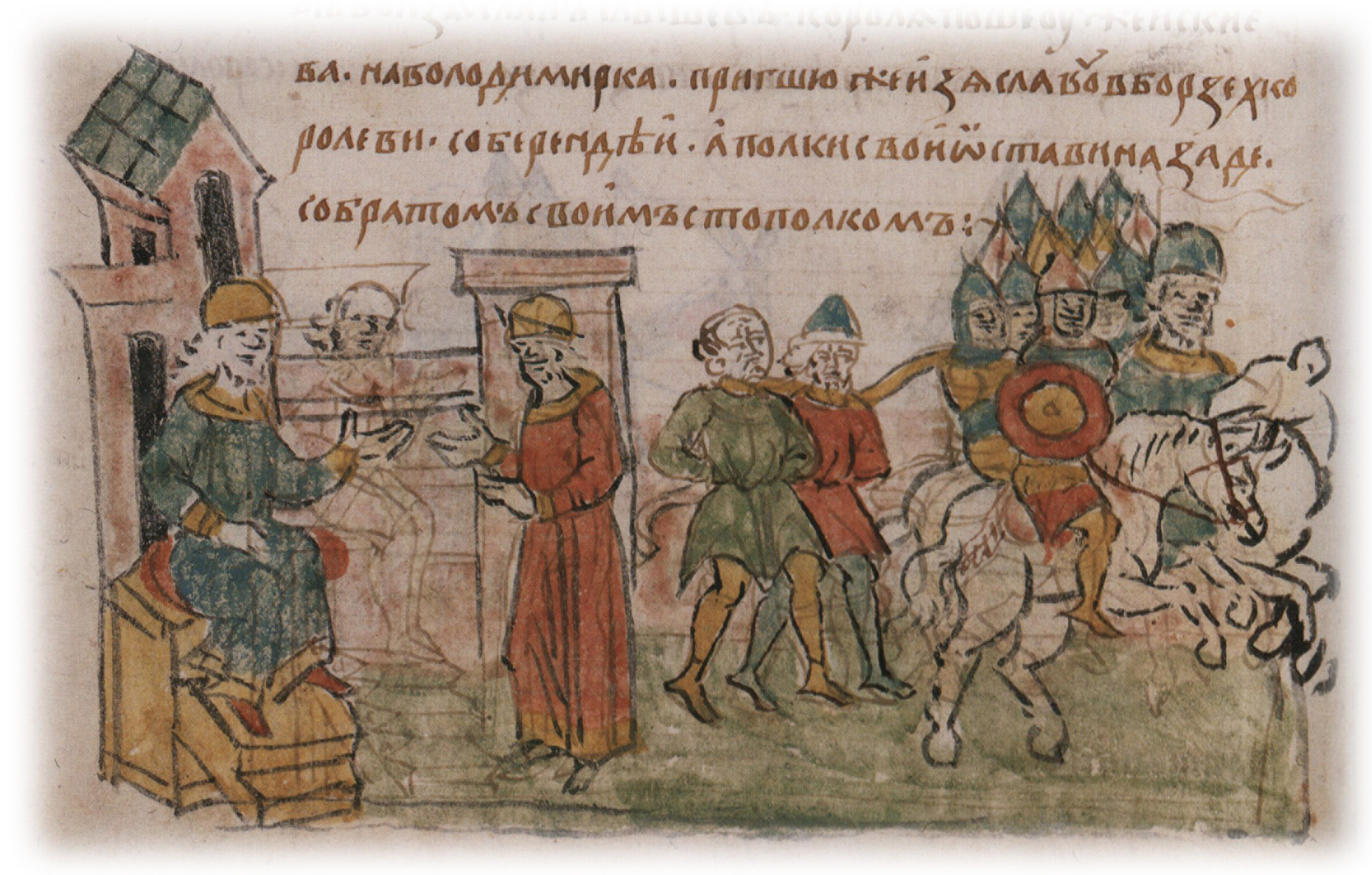 Тайное погребение Владимира Святославича, умершего в Берестове: спуск его тела на землю на ковре между разобранными клетьми здания; положение тела Владимира в мраморный гроб в церкви Святой Богородицы.