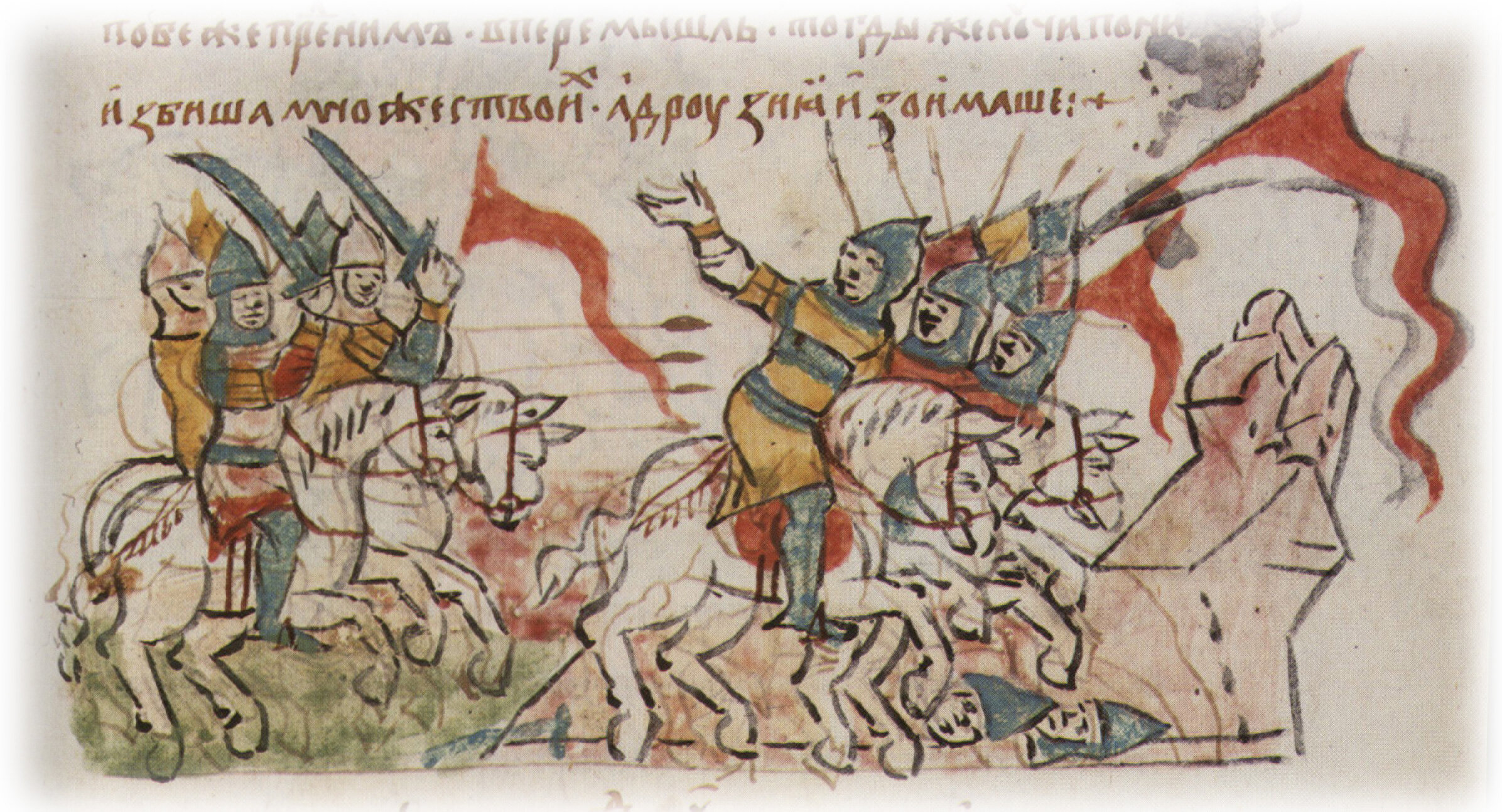 Рисунок "мастера Б" — перо. Правлен (фигуры, лица, шлемы, наконечники копий, лошади) и дополнен (сабли, знамя справа, лещадка) "мастера В" — кисть. Позднейшая пририсовка сбруи и стремян — перо.