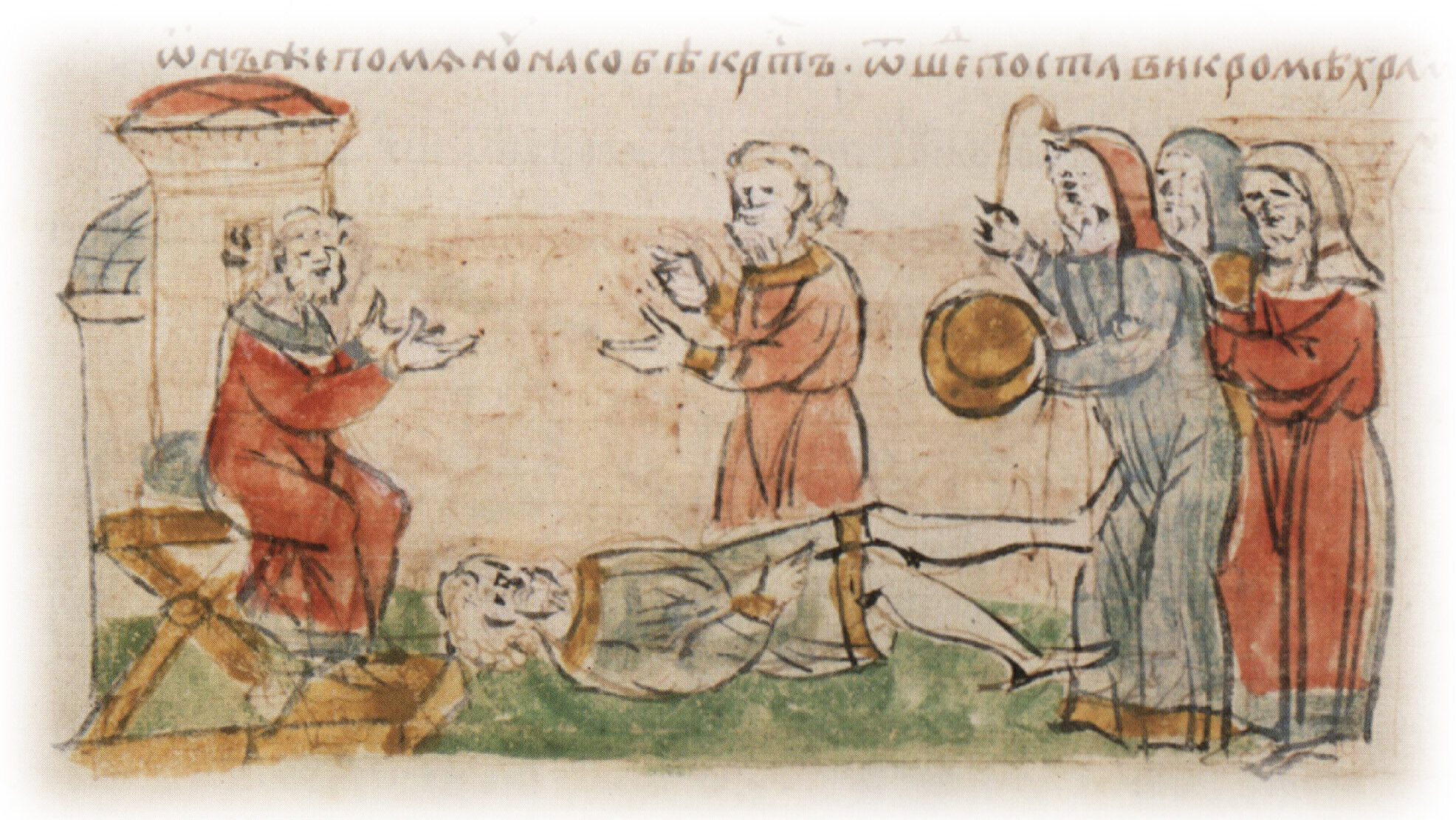 "В си бо лета приключися некоему новгородцю прийти в Чюдь, и прииде кудеснику, хотя волхованиа от него... Новгородцю же седящю на празе тоя же храмины, кудесник же, лежаще, оцепев, и шибе им бес".