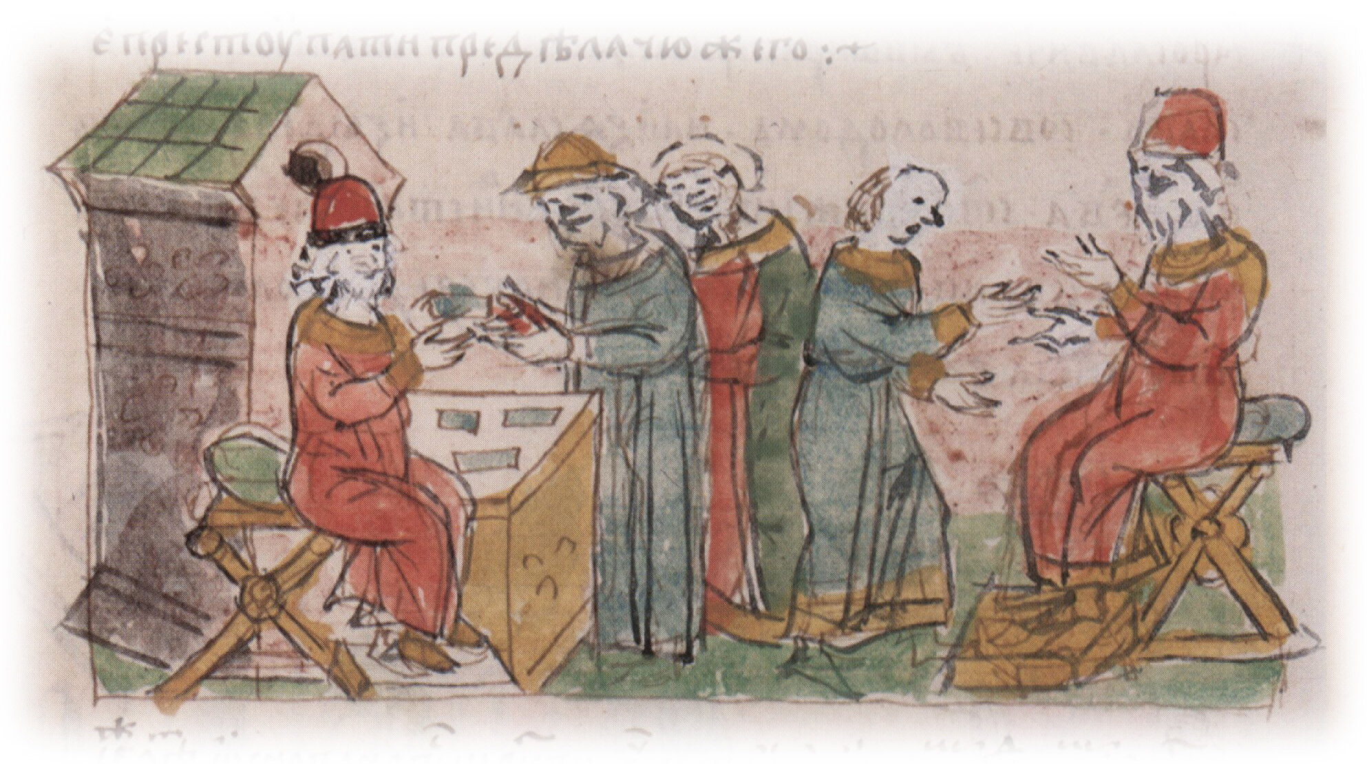 Рисунок "мастера Б" — перо. Правлен (фигуры, лица, шапки, столы, архитектура) "мастера В" — кисть
