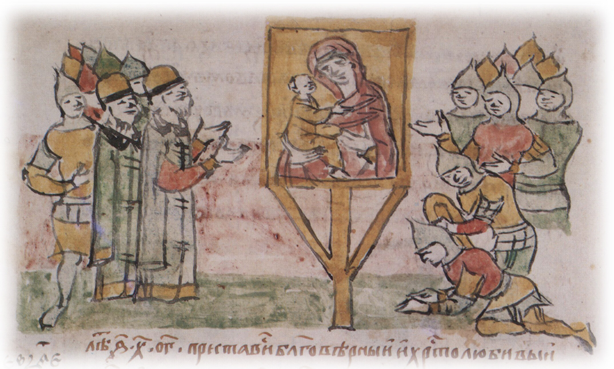 "Стояху же пешци со Святою Богородицею на полчищи под стяги... и поклонишася пред святою Богородицею, и почаша целовати Святую Богородицю с радостию великою и со слезами, хвалы и песни въздающе Ей".