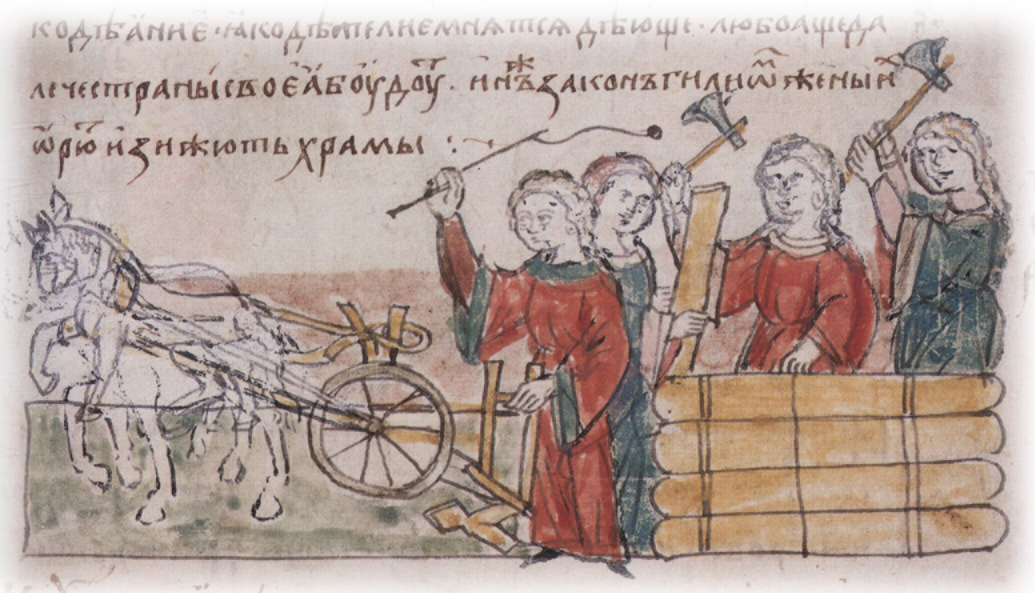 "Ин же закон гилиом: жены их орют, и зижють храмы...". Справа подпись к рисунку: "Жены орют и хоромы рубят".