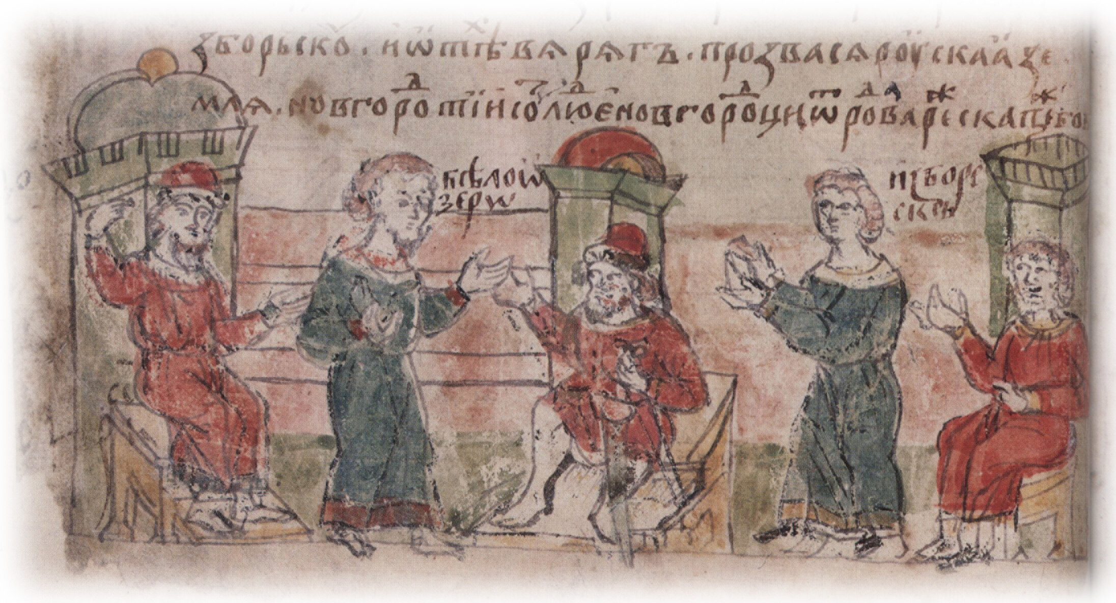 "...и седе в Ладозе старей Рюрик, а другий ("Синеус" — приписано позднее.— М. К.) сиде у нас на Белеозере, а третий Трувор в Изборьску".К каждому персонажу, олицетворяющему город, подпись: "Ладога", "Белоозеро", "Изборескъ".