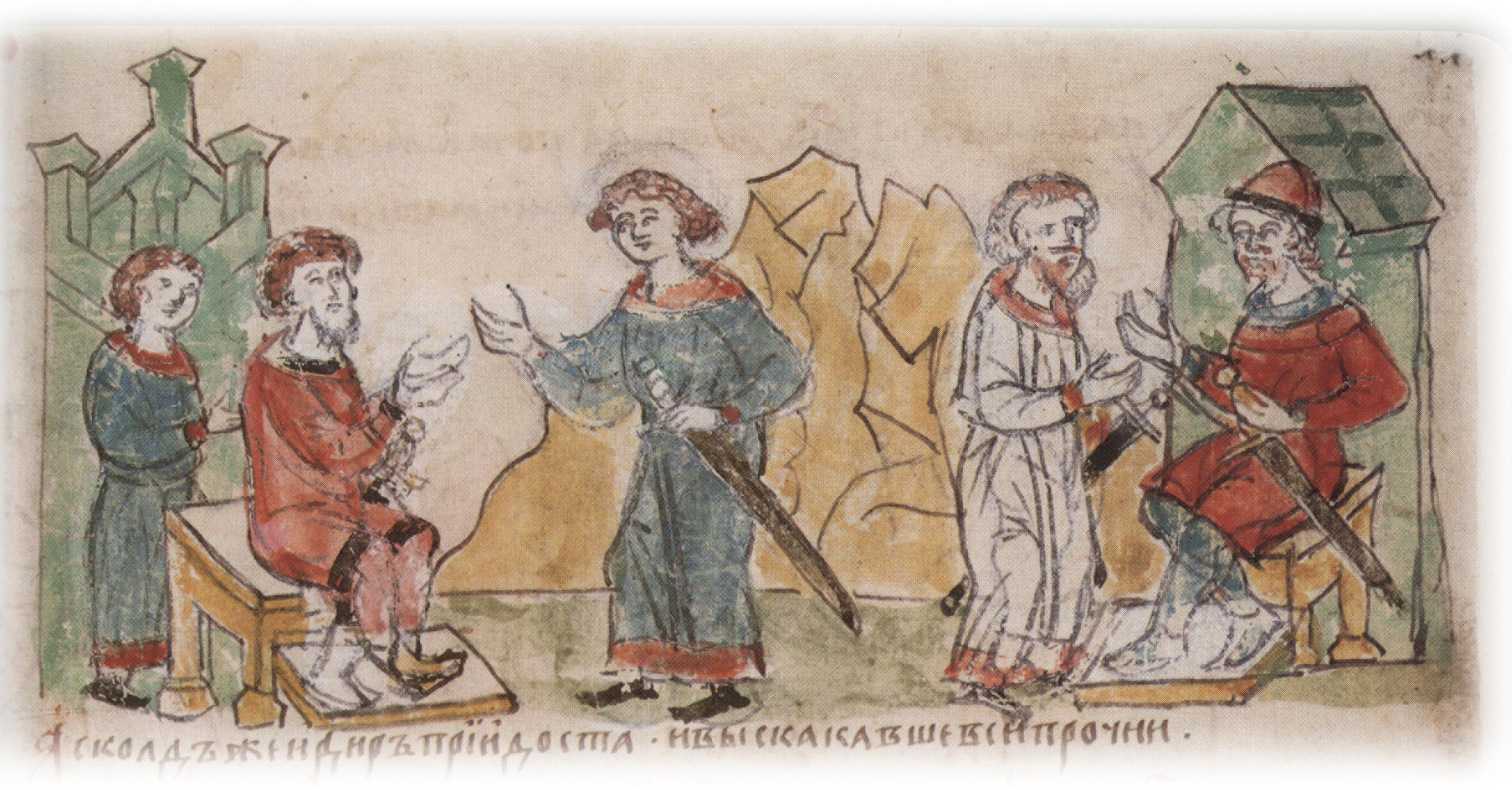 Тайное погребение Владимира Святославича, умершего в Берестове: спуск его тела на землю на ковре между разобранными клетьми здания; положение тела Владимира в мраморный гроб в церкви Святой Богородицы.