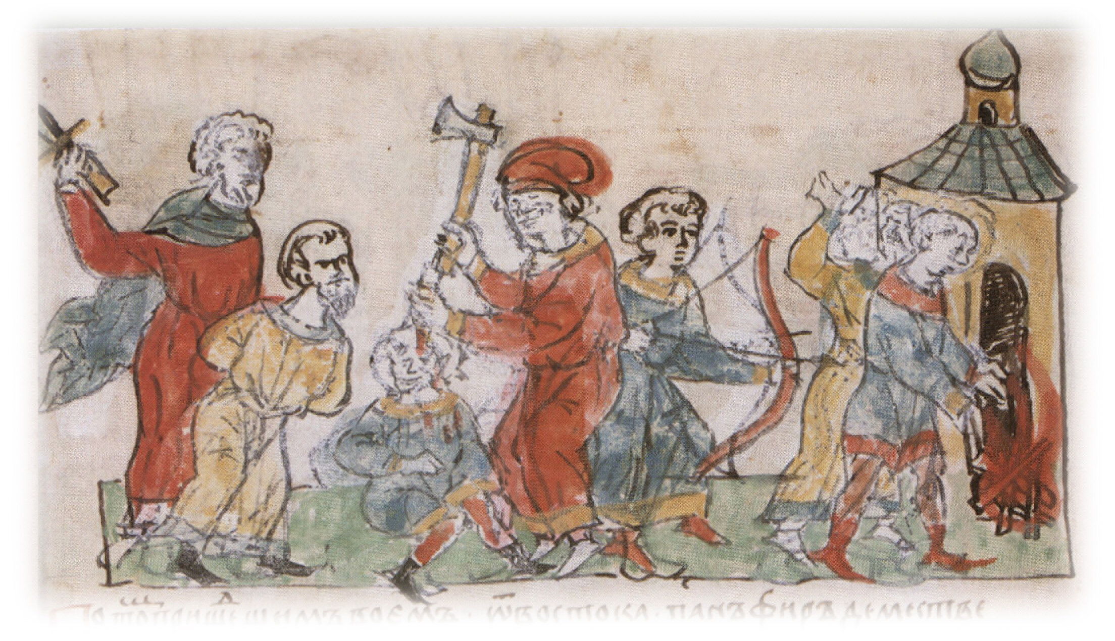"...иже поидоша, и приплыша и почаша воевати... и всю страну Никомидскую попленивше. и Суд весь пожгоша. Их же емша, овех растинаху, другия аки стра поставляюще, стреляху в ня, и изымаху, опакы руце связываху, и гвозди железны посреди главы въби-ваху им. И много же святых церквей огневи предаша...".