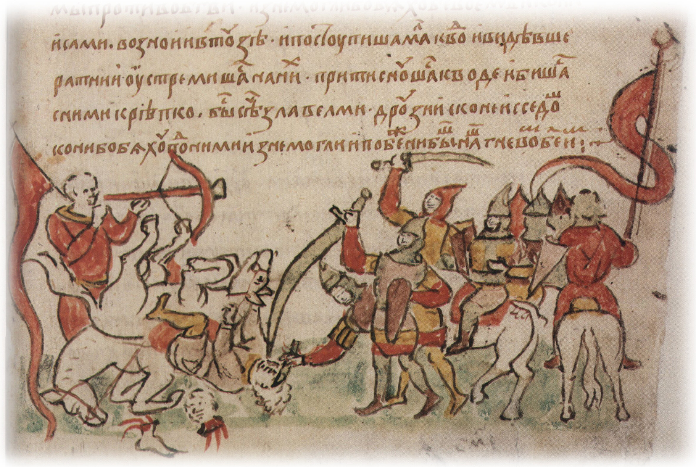 "...изнемогли бо ся бяху безводьем, и кони и сами, во зной и в тузе. И поступиша мало к воде; и видевше ратнии, устремишася на них, при гиену шася к воде и бишася с ними крепко... и побежени быша наши гневом Божеим".