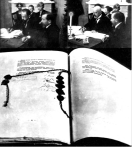 Тартуский мирный договор подписывают член ВЦИК Советов Рабочих, Крестьянских, Красноармейских и Казачьих Депутатов Адольф Абрамович Иоффе и член Учредительного Собрания Эстонии Иван Иванович Поской.