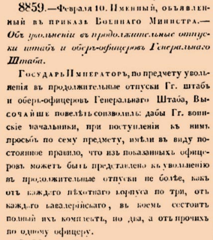8859. 1836 год. 10 февраля (22 февраля). Именный, объявленный в приказе Военнаго Министра. Об увольнении в продолжительные отпуски штаб и обер-офицеров Генеральнаго Штаба.