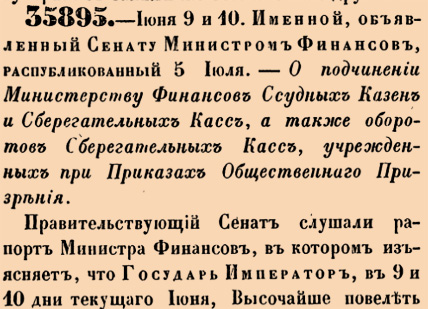 35895. 1860 год. 21 июня (9 июня ст.ст.) Именной, объявленный Сенату Министром Финансов, распубликованный 5 Июля. О подчинении Министерству Финансов Ссудных Казен и Сберегательных Касс, а также оборотов Сберегательных Касс, учрежденных при Приказах Общественнаго Призрения.Правительствующий Сенат слушали рапорт Министра Финансов, в котором изъясняет, что Государь Император, в 9 и 10 дни текущаго Июня, Высочайше повелеть изволил: 1.Ссудныя Казны и Сберегательныя Кассы, отделив ныне же от ведомства Опекунских Советов, а также обороты Сберегательных Касс, учрежденных при Приказах Общественнаго Призрения, подчинить Министерству Финансов. <…>