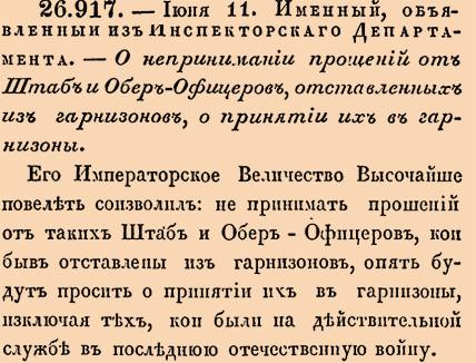 26917. 1817 год. 23 июня (11 июня ст.ст.) Именный, объявленный из Инспекторскаго Департамента. О непринимании прошений от Штаб и Обер-Офицеров, отставленных из гарнизонов, о принятии их в гарнизоны.Его Императорское Величество Высочайше повелеть соизволил: не принимать прошений от таких Штаб и Обер-Офицеров, кои быв отставлены из гарнизонов, опять будут просить о принятии их в гарнизоны, изключая тех, кои были на действительной службе в последнюю отечественную войну.