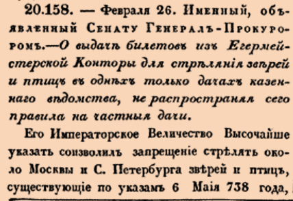 Закон № 20158. 1802 год. 26 февраля (10 марта). Указ об ограничении действия платных охотничьих билетов исключительно государственными угодьями и подтверждении исключительного права дворян на охоту в пределах их частных владений.