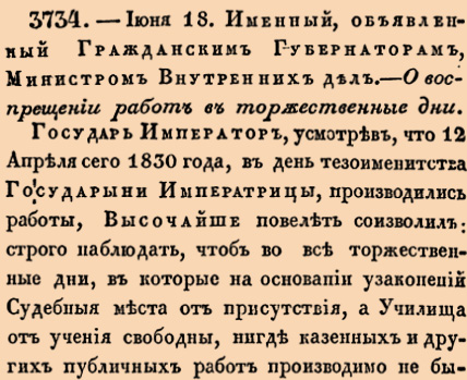 3734. 1830 год. 18 июня (30 июня). Именный, объявленный Гражданским Губернаторам, Министром Внутренних дел. О воспрещении работ в торжественные дни.