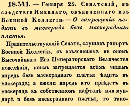 18.341. Сенатский, в следствие Именного, объявленного из Военной Коллегии. 5 февраля (25 января ст.ст.) 1798 года. Царствование Императора Павла IО запрещении ездить в маскарад без маскарадного костюма.Правительствующий Сенат, слушав рапорт Военной Коллегии, с изъяснением в оном Высочайшего Его Императорского Величества повеления, коим запрещается всем чинам впред без маскарадного платья ездить в маскарад; а ежели впредь кто приедет в маскарад в собственном кафтане или мундире и без маскарадного платья, то таковых брать под караул, Приказали: для должного и непременного сего Высочайшего Его Императорского Величества повеления исполнения, предписать всем Военным Губернаторам и Губернскими Правлениями указами.