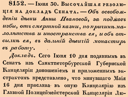 8152. 1740 год. 30 июня (11 июля). Высочайшая резолюция на доклад Сената. Об освобождении девки Анны Ивановой, за поджог избы, от смертной казни, по причине малолетства и иностранства ея, и об отсылке ея, в дальний девичий монастырь в работу.