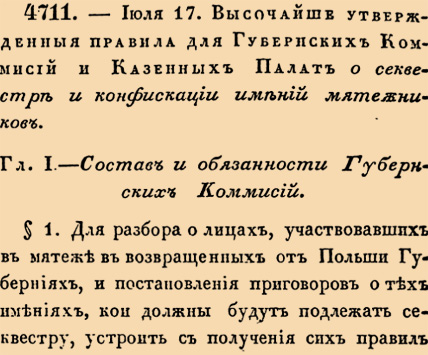 4711. 1831 год. 29 июля (17 июля ст.ст.) Высочайше утвержденныя правила для Губернских Коммисий и Казенных Палат о секвестре и конфискации имений мятежников.Для разбора о лицах, участвовавших в мятеже в возвращенных от Польши Губерниях, и постановления приговоров о тех имениях, кои должны будут подлежать секвестру, устроить с получения сих правил урежденныя пред сим по Высочайшим повелениям на сей конец Коммисии в одинаковом составе, а именно: по одной в каждой из нижеследующих Губеринй: Киевской, Виленской, Гродненской, Минской, Волынской, Подольской и Белостоксой Области, а буде нужно, то и в Губерниях Витебской и Могилевской <…>