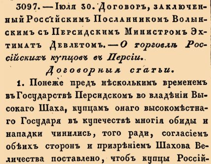 3097. 1717 год. 10 августа (30 июля ст.ст.) Договор, заключенный Российским Посланником Волынским с Персидским Министром Эхтимат Девлетом. О торговле Российских купцов в Персии.Договорные статьи. 1. Понеже пред нескольким временем в Государстве Персидском во владении Высокаго Шаха, купцам онаго высокоместнаго Государя в купечестве многия обиды и нападки чинились, того ради, согласием обеих сторон и призрением Шахова Величества поставлено, чтоб купцы Российские, когда и в какое время товары привезши в Низовую или в иное место прибудут, и тогда б оных купцов не задерживали, и вьюки Российских купцов не развязывали бы, ибо начальники для своих корыстей развязывают <…>