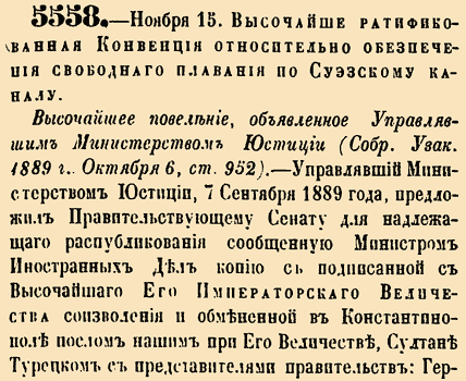 5558. — 27 ноября (15 ноября), 1888 г.Высочайше ратифицированная Конвенция относительно обеспечения свободного плавания по Суэцкому каналуВысочайшее повеление, объявленное Управлявшим Министерством Юстиции. — Управлявший Министерством Юстиции, 7 Сентября 1889 года, предложил Правительствующему Сенату для надлежащего распубликования сообщенную министром Иностранных Дел копию с подписанной с Высочайшего Его Императорского Величества соизволения и обмененной в Константинополе послом нашим при Его Величестве, Султане Турецком с представителями правительств: Германского, Австрийского, Французского, Английского, Итальянского, Нидерландского и Турецкого Конвенции относительно обеспечения свободного плавания по Суэцкому каналу