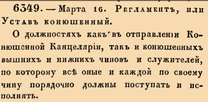 6349. 1733 год. 16 марта (27 марта). Регламент, или Устав конюшенный. О должностях как в отправлении Конюшенной Канцелярии, так и конюшенных вышних и нижних чинов и служителей