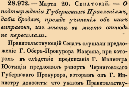 28972. 1822 год. 1 апреля (20 марта ст.ст.) Сенатский. О подтверждении Губернским Правлениям, дабы бродяг, прежде учинения об них выправок, из места в место отнюдь не пересылали <…> Приказали: как указами Сената, разосланными повсеместно Декабря 29-го 1819 года, подтверждено: беглых и безпашпортных людей, до учинения об них выправок, не пересылая из место в места, содержать там, где они пойманы