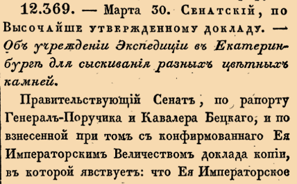 12369. 1765 год. 10 апреля (30 марта ст.ст.) Сенатский, по Высочайше утвержденному докладу. Об учреждении Экспедиции в Екатеринбург для сыскивания разных цветных камней.<…>Быть по сему. А на первой случай ассигновать до 20000 из Екатеринбургских медных денег, а на отправление отселе выдать потребную сумму из Кабинета, и быть сей Экспедиции в ведомстве Г.Бецкаго.