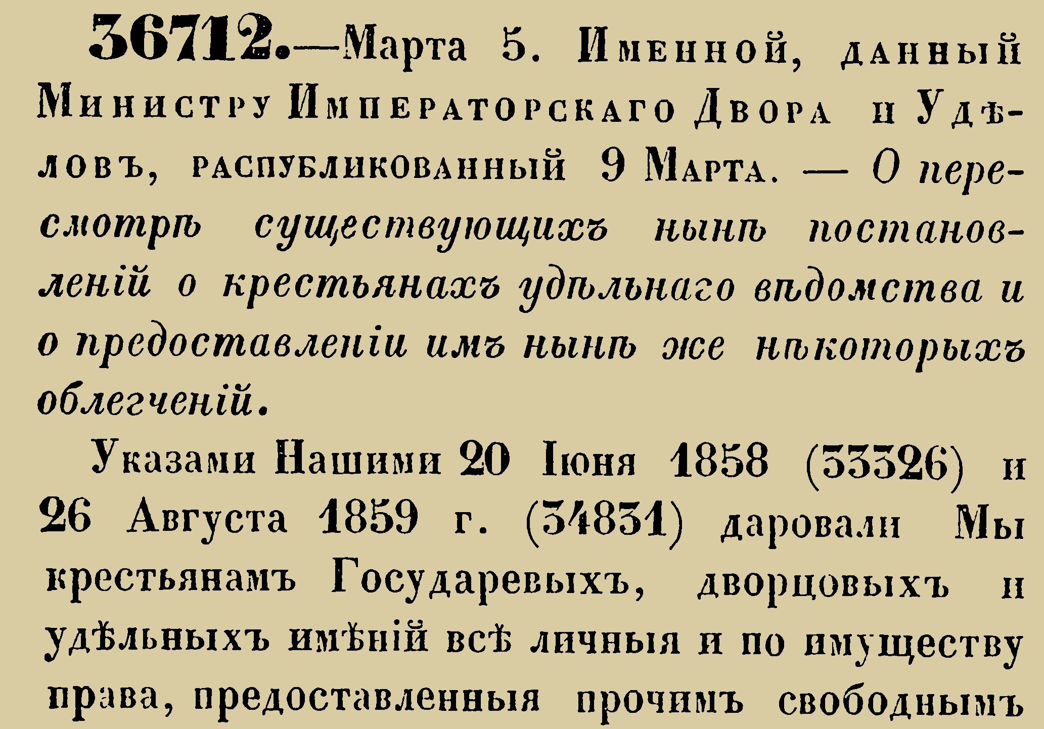 Закон № 36712.- 1861 год, 5 марта (17 марта). Указ о начале реформы правового и экономического положения крестьян удельного ведомства с предоставлением им права выкупа земель и создания органов местного самоуправления.