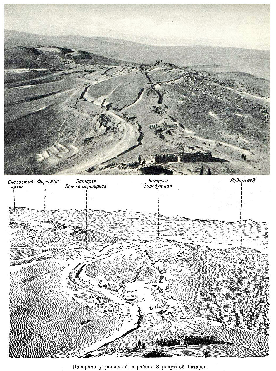 Фотография места событий (1904 г.) и пояснительный рисунок из издания: Сорокин А. И. Оборона Порт-Артура. Русско-японская война 1904–1905. — М.: Воениздат, 1952. — С. 145.