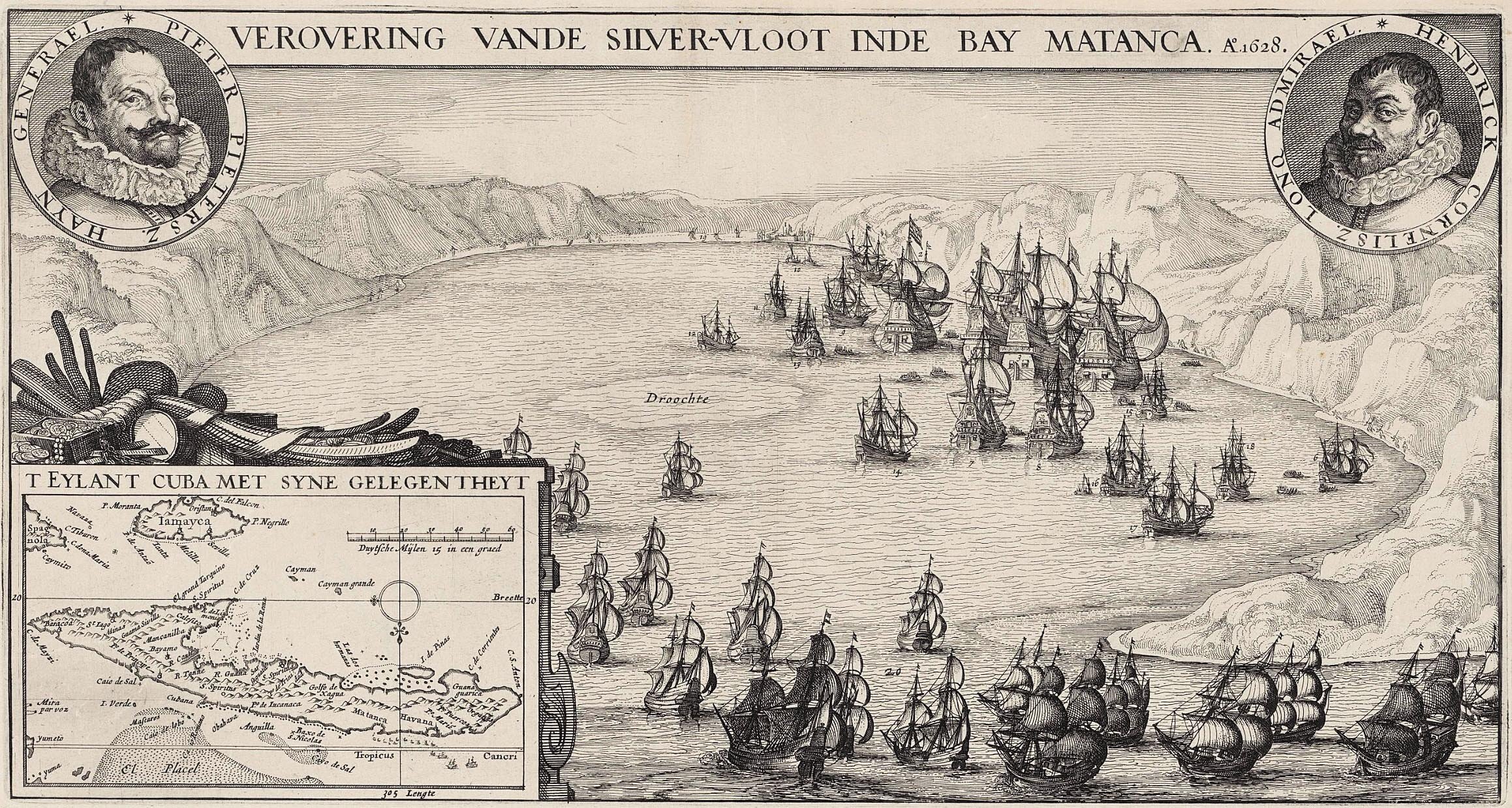 Слева в картуше: Пит Питерсон Хайн (иной вариант Хейн) или Пит Хейн-старший (нидерл. Piet Pieterszoon Hein или Pieter Pietersen Heyn; 25 ноября 1577 — 18 июня 1629) — голландский адмирал Вест-Индской Компании и Соединённых провинций, герой восьмидесятилетней войны в Нидерландах, прославленный капер.
