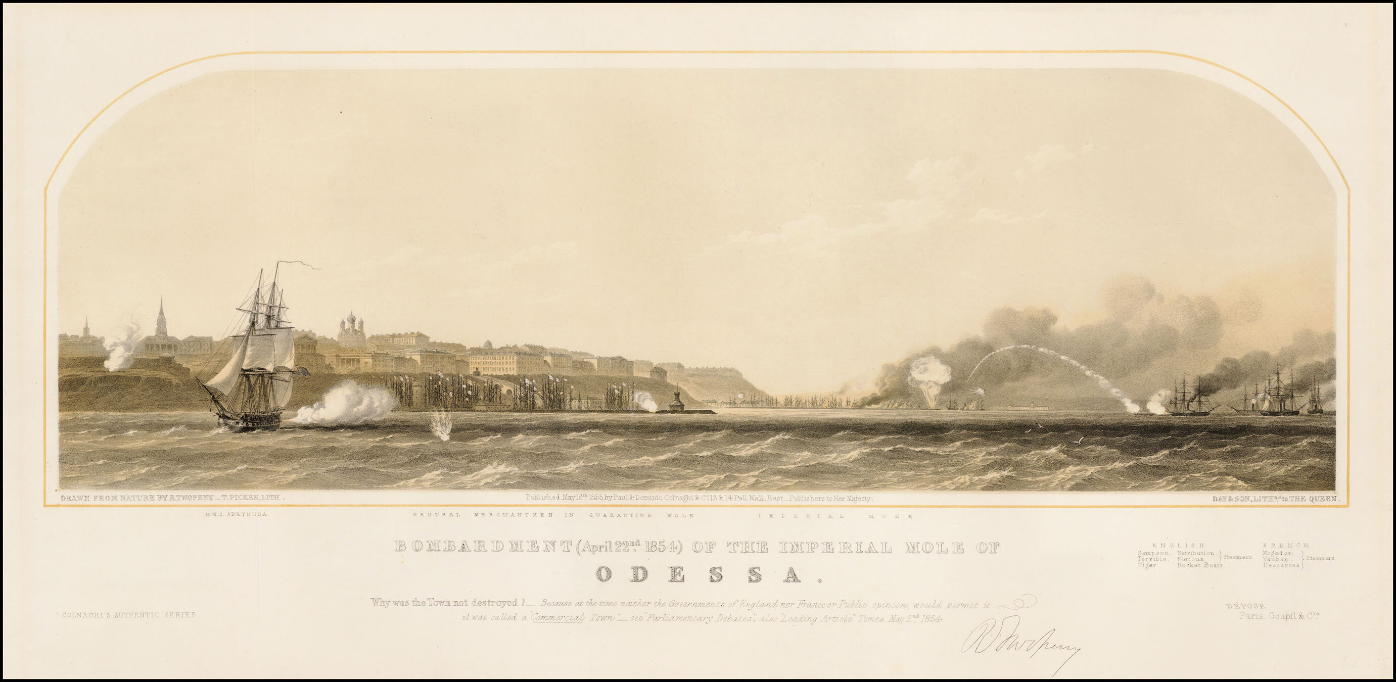 Надпись на литографии: «Почему этот город не был уничтожен. Потому что в это время ни британское, ни французское правительство, ни общественное мнение не могли этого допустить, поскольку порт считася торговым»