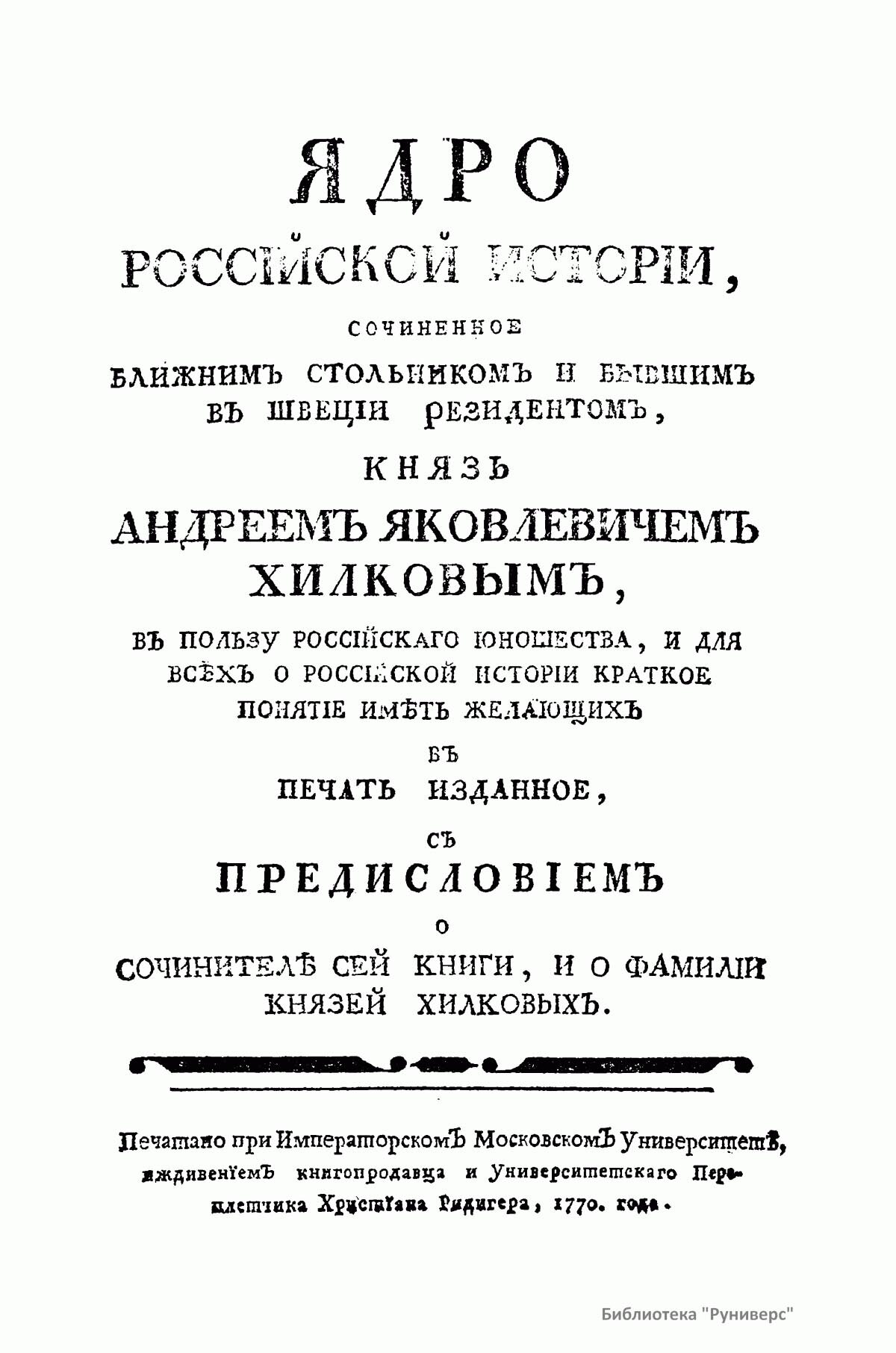 Ядро российской истории, сочиненное ближним стольником и бывшим в Швеции резидентом, князь Андреем Яковлевичем Хилковым,в пользу российскаго юношества, и для всех о российской истории краткое понятие иметь желающих в печать изданное, с предисловием и о сочинителе сей книги, и о фамилии князей Хилковых. — М., 1770.