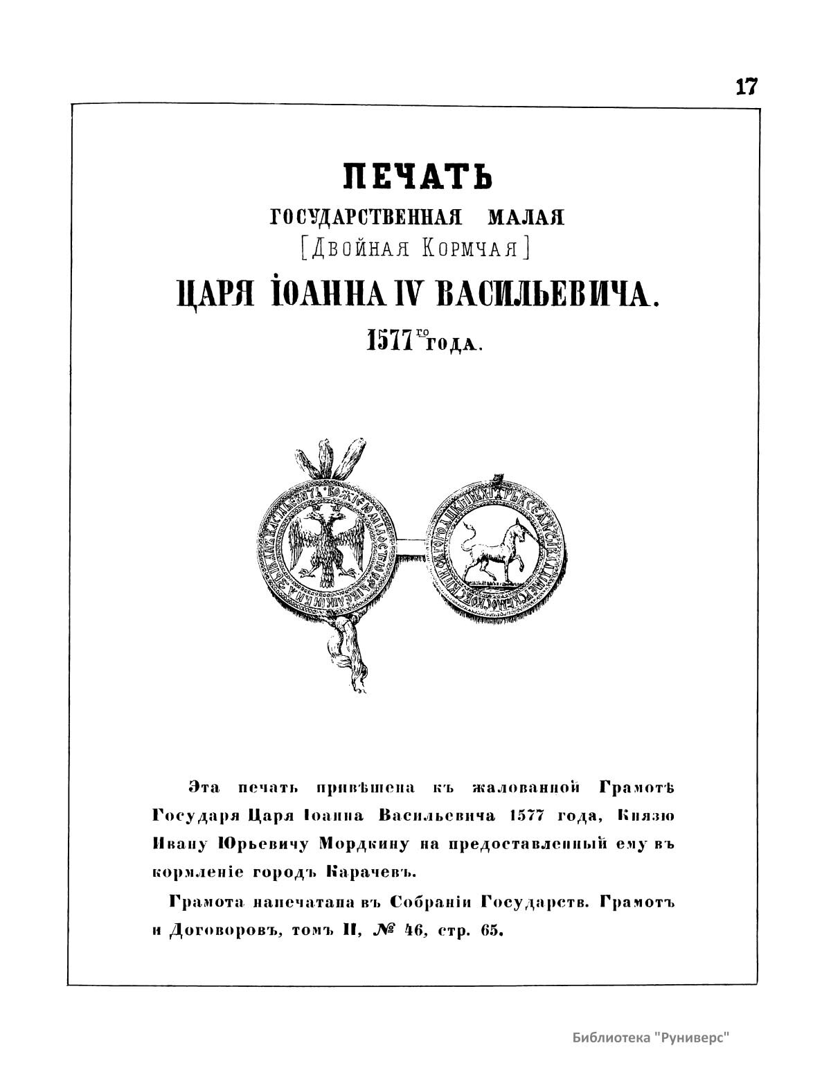 a:2:{s:4:"TEXT";s:276:"Примечание издателя: Эта печать привешена к жалованной грамоте Государя Царя Иоанна IV Васильевича 1577 года, Князю Ивану Юрьевичу Мордкину на предоставленный ему вь кормление город Карачев. Грамота напечатана в Собрании Государственных Грамот и Договоров, томъ II, стр. 65 ";s:4:"TYPE";s:4:"html";}