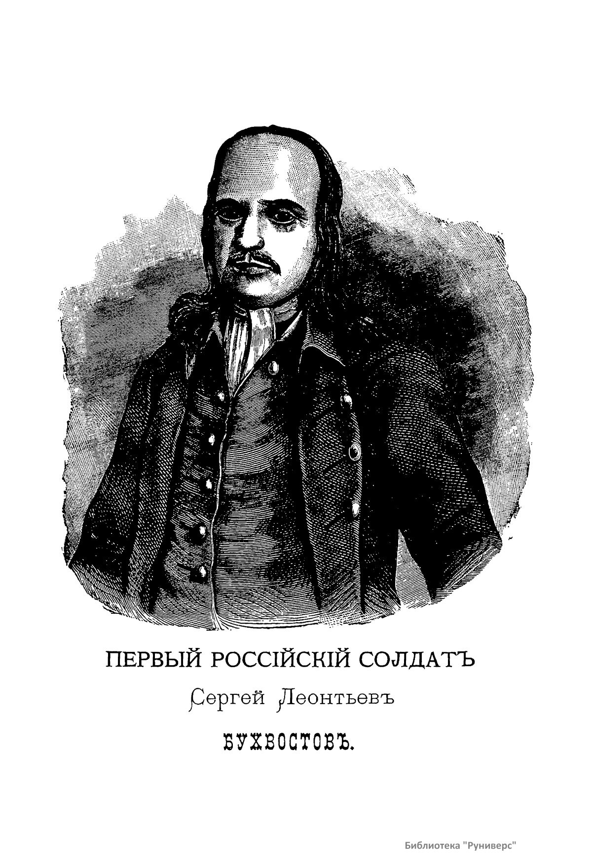 Бухвостов Сергей Леонтьевич (1659 — 1728) — начал службу в конюшенном штате, а в ноябре 1683 г. первым записался в потешные к 11-летнему царю Петру, который впоследствии и прозвал Бухвостова первым российским солдатом. Бухвостов участвовал в Кожуховском походе, в обоих походах под Азов и к началу Великой северной войны дослужился до капрала. Преображенский полк, в котором служил Бухвостов, участвовал во сражениях Северной войны. К концу борьбы Петра с Карлом XII, «первый русский солдат» был уже капитаном артиллерии. Боевую службу Бухвостов закончил в Померании: при взятии Штетина он был тяжело ранен, и Петр I, ценивший заслуги искалеченного воина, произвел его в майоры артиллерии и зачислил в петербургский гарнизон, где он пробыл до самой смерти.