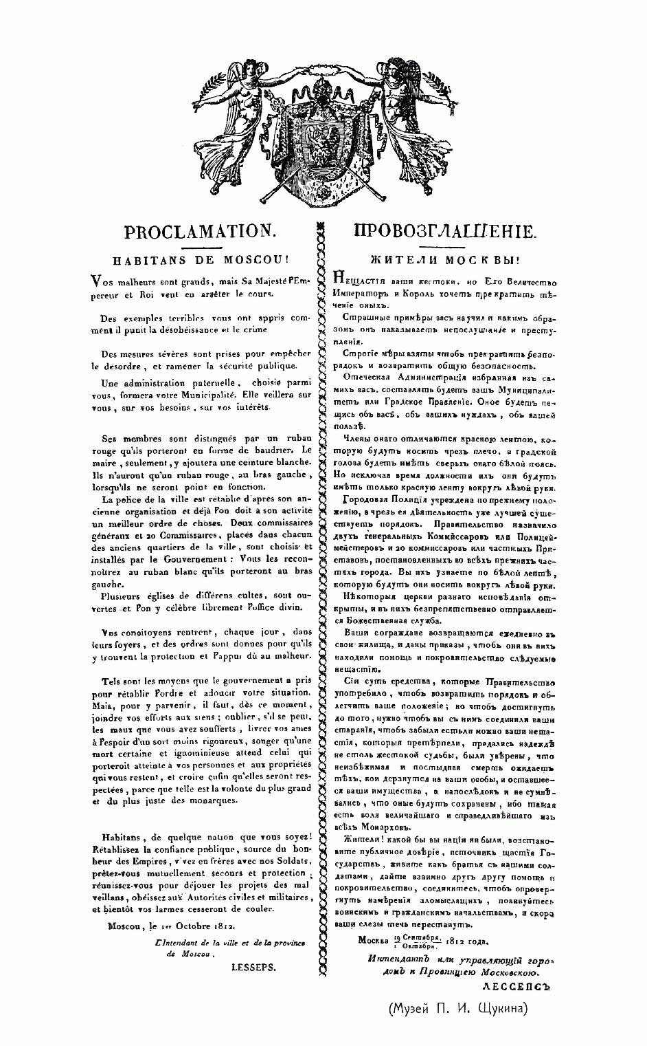 Прокламация оккупационной администрации, учрежденной наполеоновской армией в Москве в 1812 году.