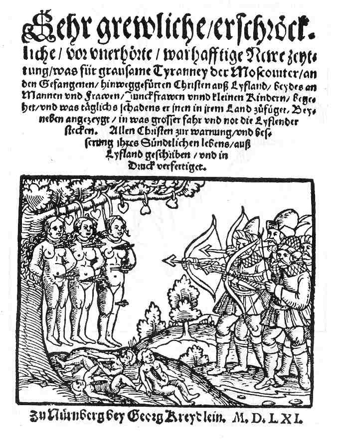 «Весьма мерзкие, ужасные, доселе неслыханные, истинные новые известия, какие зверства совершают московиты с пленными христианами из Лифляндии, мужчинами и женщинами, девственницами и детьми, и какой вред ежедневно причиняют им в их стране. Попутно показано, в чем заключается бoльшая опасность и нужда лифляндцев. Всем христианам в предостережение и улучшение их греховной жизни писано из Лифляндии и напечатано»