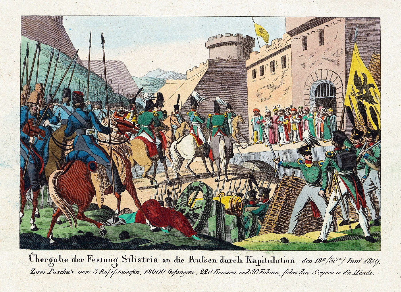 Внизу подпись на немецком языке: «В руки победителей попали: два трехбунчужных паши, 18 000 пленных, 220 пушек и 80 знамен»