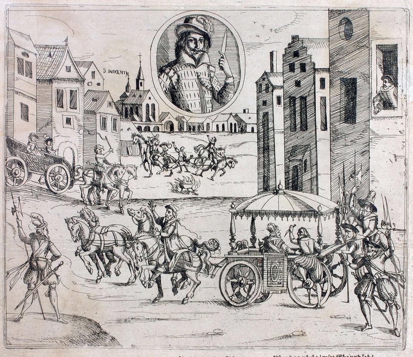 На улице Ла Ферроннери, и без того узкой, а вдобавок к этому еще застроенной (вопреки королевскому запрету, объявленному еще более полувека (!) тому назад, при короле Генрихе II) лавками, карета вынужденно замедлила ход. Когда она поравнялась с лавкой, на вывеске которой красовалось коронованное сердце, пронзенное стрелой, путь ей преградили воз сена и телега, груженная бочками с вином. Ливрейные слуги побежали отдавать распоряжения, дабы расчистить дорогу. Кое-кто, дабы срезать путь, направился прямиком через кладбище Невинноубиенных, намереваясь встретить королевскую карету, когда она минует уличную пробку. Король тем временем, обняв правой рукой Эпернона, подал ему письмо, чтобы тот вслух прочитал его, а левой рукой оперся о плечо Монбазона. В этот момент Равальяк, прятавший под плащом кинжал, подбежал к карете, одной ногой встал на каменную тумбу на обочине улицы, а другой — на ось колеса и левой рукой нанес кинжалом удар королю, причинив ему на уровне второго ребра поверхностную рану. «Я ранен», — удивленно сказал король и, подняв руку, открыл свою грудь. Тогда Равальяк ударил во второй раз. Кинжал вонзился между пятым и шестым ребрами, пробив легкое, полую вену и аорту, сделав уже ненужным третий удар, скользнувший по рукаву Монбазона. Генрих IV попытался снова заговорить, но на этот раз кровь, хлынувшая из горла, заглушила слова.