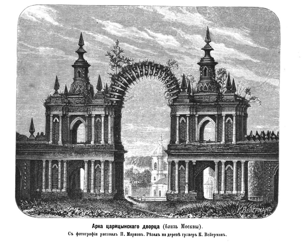 С приближением к Царыцину, является странная игра оптики: сквозь зеленую сетку лесов виднеются черные, высокие башни с таковыми же верхами и шпицами по бокам; но чем ближе подъезжаешь к нему, тем мрачнее, суровее и насупленнее кажется оно: крыша дворца-замка, также черная и мрачная, представляется подобною крыше гробницы, окруженной католическими монахами, кармелитами, францисканами или капуцинами, безмолвно недвижно стоящими около нее, в нахлобученных на глаза шапках, с потухшими траурными факелами в руках. Но когда въезжаешь в самые пределы Царицына на расстилающийся, пестреющий цветами и зеленью луг, заменяющий красный двор, когда вступаешь на этот волнистый, самородный бархат — декорация переменяется, являются новые картины: разбросанные там и сям домики, изящно планированные сады в английском вкусе, с широкими густолиственными аллеями.