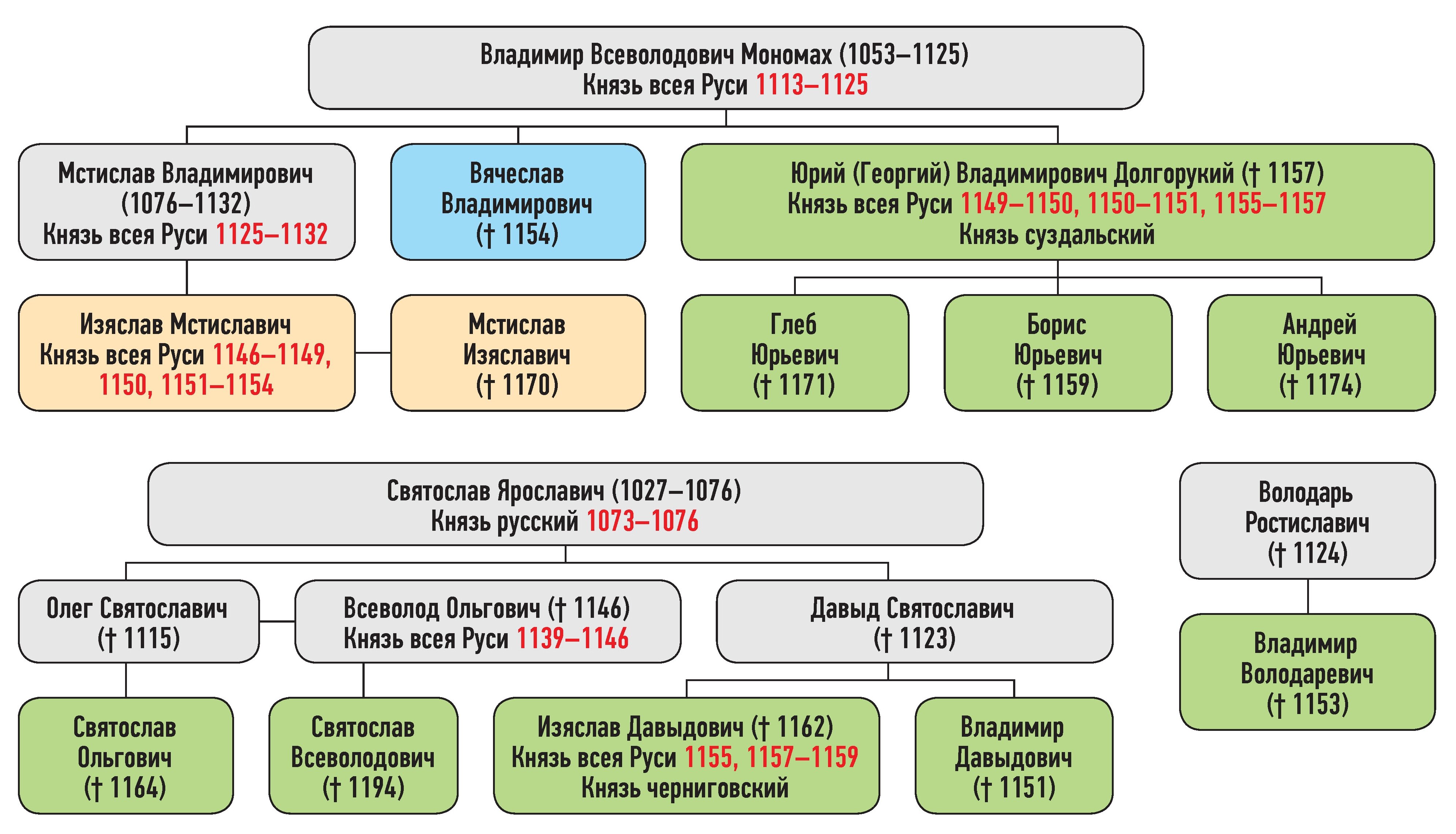 Изяслав Мстиславич — сын Мстислава Владимировича, Мстислав Изяславич — сын Изяслава Мстиславича, Юрий Владимирович — сын Владимира Всеволодовича Мономаха, Ростислав, Андрей, Борис Юрьевичи — сыновья Юрия Владимировича, Изяслав, Владимир Давыдовичи — сыновья Давыда Святославича, Святослав Ольгович — сын Олега Святославича, Святослав Всеволодович — сын Всеволода Ольговича, Владимир Володаревич — сын Володаря Ростиславича, Вячеслав Владимирович — сын Владимира Всеволодовича Мономаха