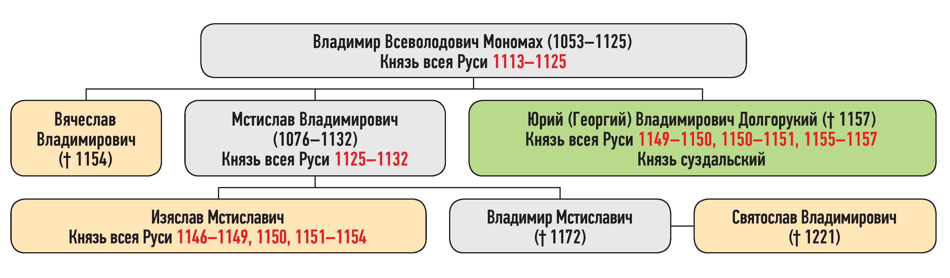 Изяслав Мстиславич — сын Мстислава Владимировича, Вячеслав Владимирович — сын Владимира Всеволодовича Мономаха, Святослав Владимирович — внук Мстислава Владимировича, Юрий Владимирович — сын Владимира Всеволодовича Мономаха