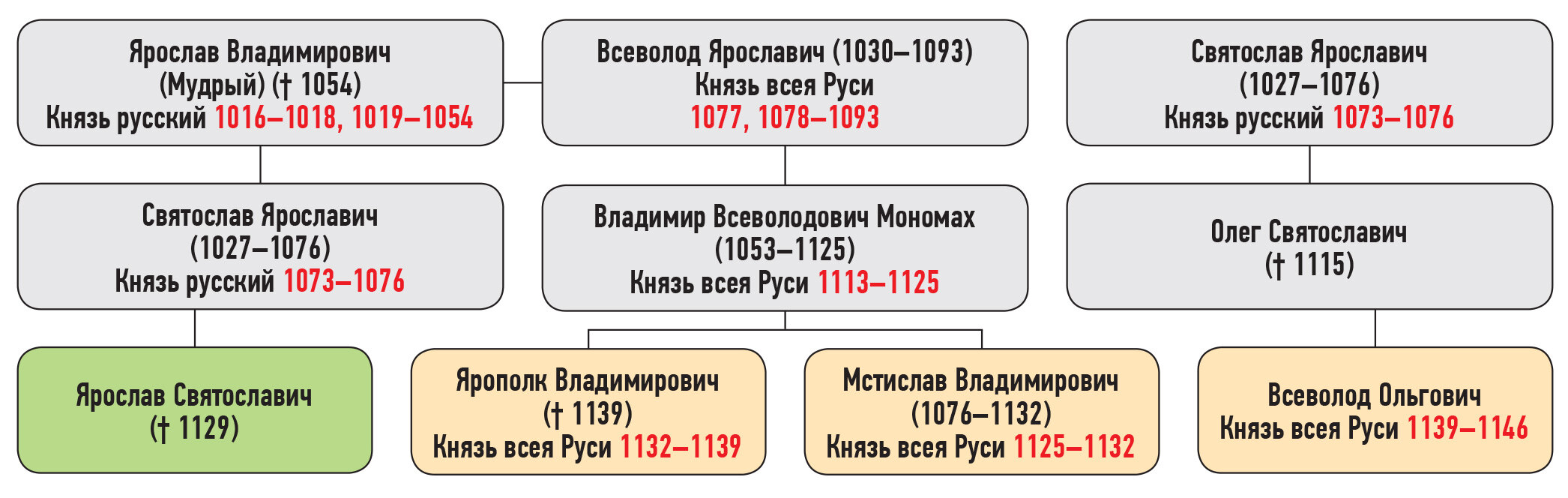 Мстислав Владимирович — сын Владимира Мономаха, Ярополк Владимирович — сын Владимира Мономаха, Ярослав Святославич — сын Святослава Ярославича, Всеволод Ольгович — сын Олега Святославича