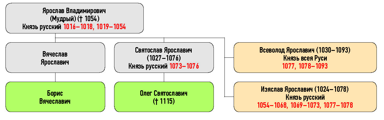 Ярослав Владимирович (Мудрый) († 1054), Вячеслав Ярославич, Святослав Ярославич (1027–1076), Всеволод Ярославич (1030–1093) Князь всея Руси, Борис Вячеславич, Олег Святославич († 1115), Изяслав Ярославич (1024–1078) Князь русский