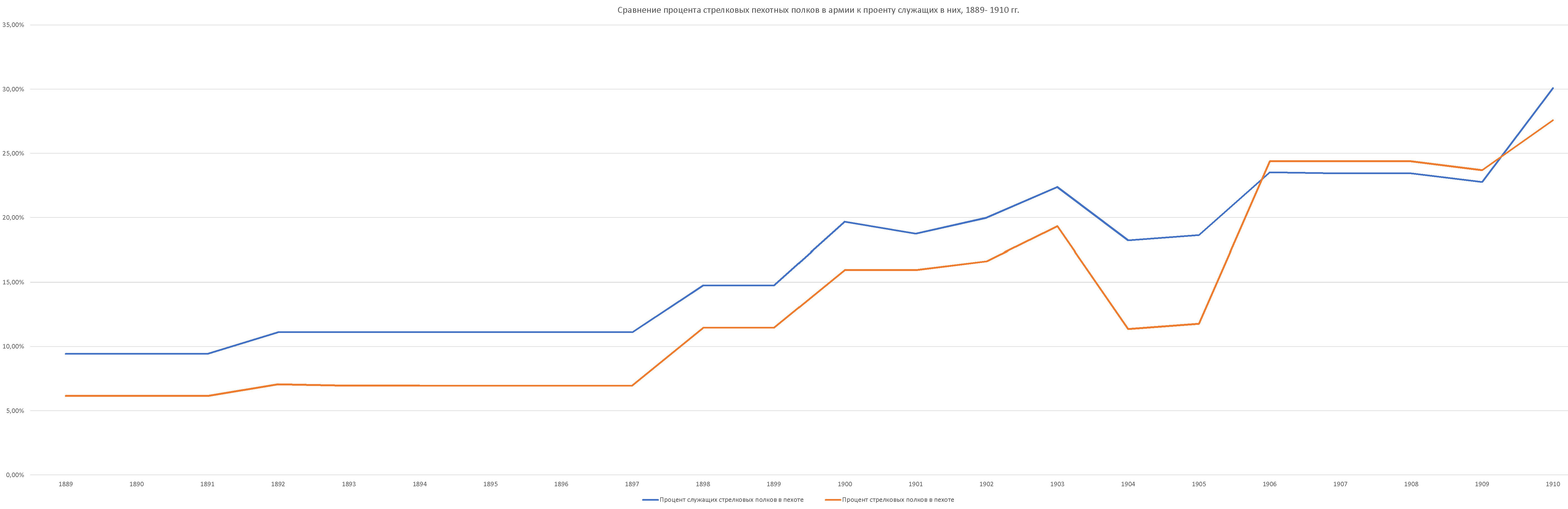 Сравнение процента стрелковых пехотных полков в русской армии к проенту служащих в них
